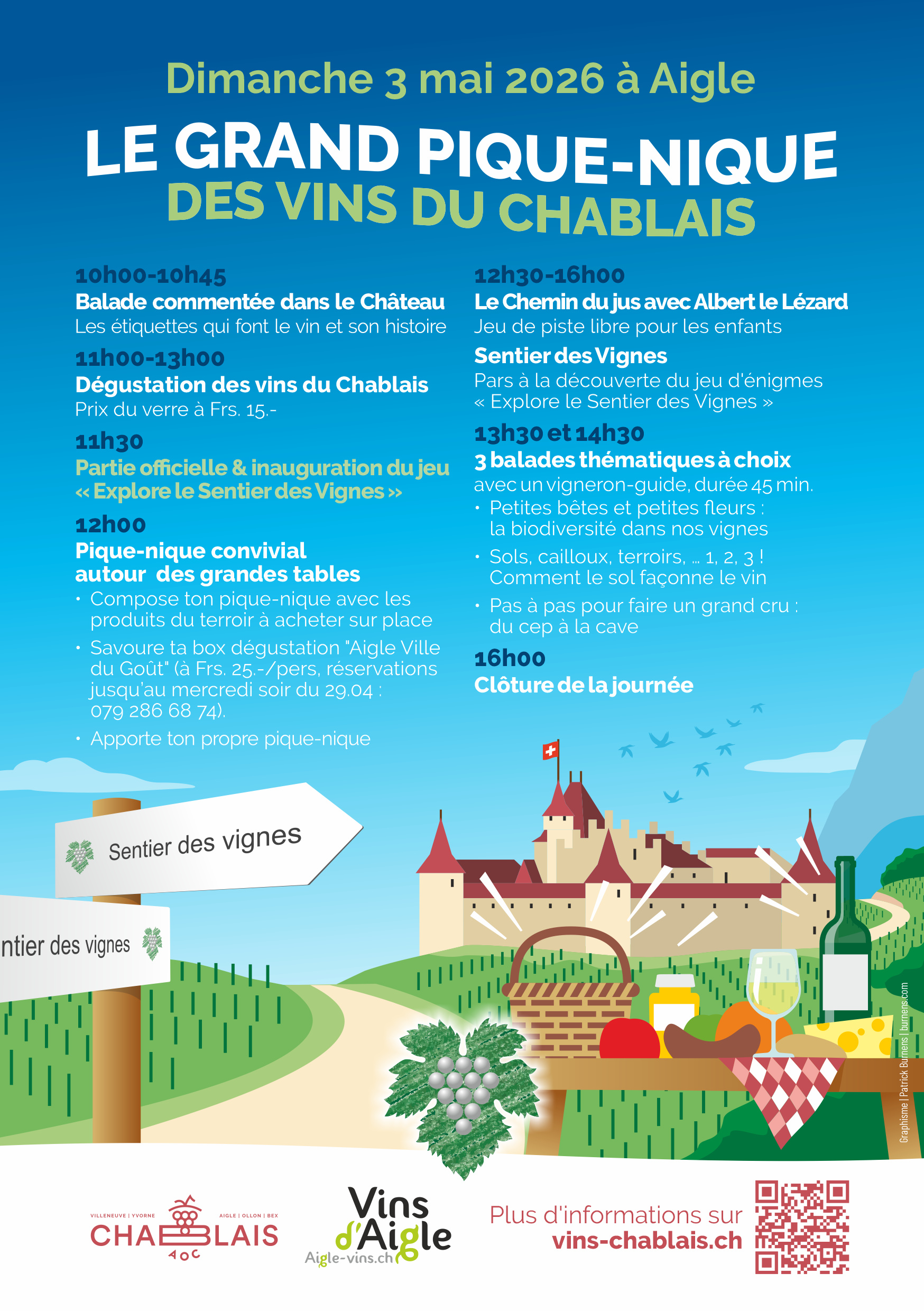 Le Grand Pique-Nique des Vins du Chablais s’annonce comme un rendez-vous festif, convivial et ouvert à toutes et tous. Nous vous invitons à partager une journée gourmande, qui sera également l’occasion d’inaugurer le jeu « Explore le Sentier des Vignes ». Au fil des dégustations des vins du Chablais avec 15 vignerons présents, d’un pique-nique autour de grandes tablées, de petites balades thématiques dans les environs et un jeu amusant pour les enfants, nous vous invitons à découvrir le terroir autrement.